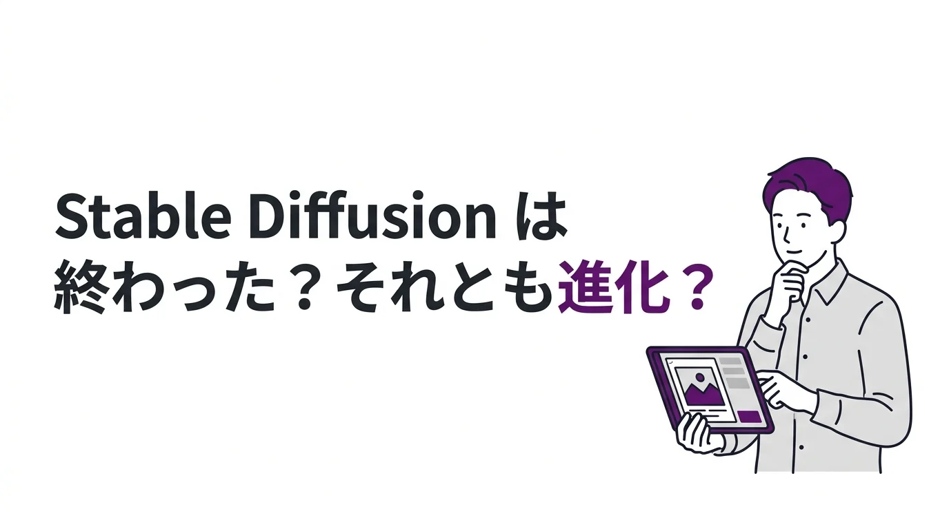 「Stable Diffusion、最近ぜんぜん名前聞かなくなったな……」——2022〜23年にあれだけ盛り上がったのに、そう感じている方は多いはずです。結論から言うと、SDは”終わった”わけではありません。ただし、取り巻く環境は激変しています。この記事では現役エンジニアの視点から、話題が減った背景・技術の進化・競合との比較・市場予測をニュートラルにまとめ、あなたが再入門すべきか・業務に使えるかの判断材料をお渡しします。